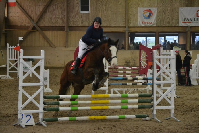 Adèle l'a prise dans la 2, la jument la teste un peu à la détente, mais dans l'ensemble, très bien. Le problème reste l'attente devant la porte... Beaucoup trop de cavaliers avant de passer, on se demande pourquoi on détend les chevaux ! Comme on passe en groupe, on fait garder notre place pour la marcher, mais même comme ça, c'est long ... Sur la piste, pareil, SM imperturbable, rien a foutre du restaurant, du monde dans la tribune, des couleurs des obstacles ... Tout va bien dans le meilleur des mondes ^^ Elles s'en sortent en 8pts, ce qui est tout à fait honorable. Le tour manque un petit chouilla de contrôle, ce sont des verticaux, la bête noire de la grisette, qui tombent. Bref, je suis contente.
