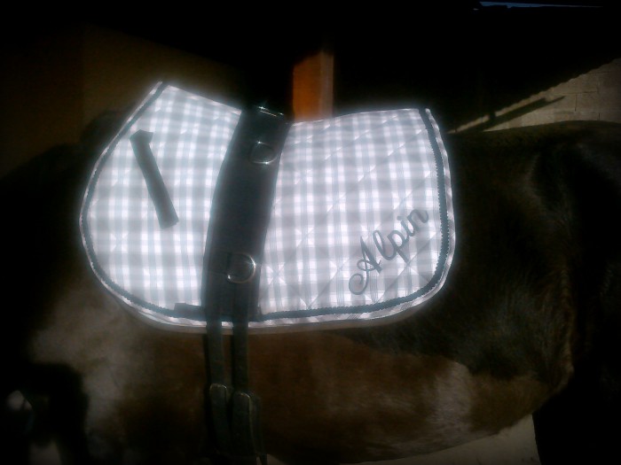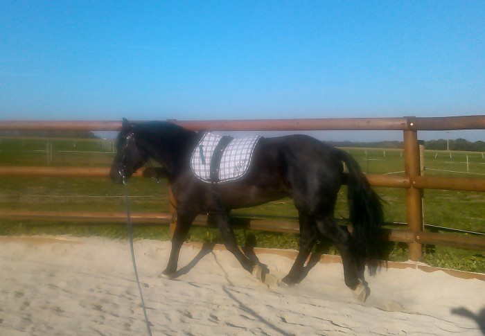 - et hier une séance de plat avec Image, hanches en dedans, épaules en avant. J'avais une petite paire de RA branchées sur les côtés de la sangle, il est vraiment top comme ça et se met plus dans le boulot que sans où il cherche tout le temps la faille pour faire le con et tester. Il faisait les exercices super bien, jusqu'à la fin où il est un peu dérangé à gauche, j'arrive à finir sur un passage épaules en dedans au galop correct mais je ne fais pas à droite parce qu'il était complètement bloqué par une envie de pisser, faisait 2 pas, s'arrêtait, recommençait... C'était la fin de séance, j'ai désanglé et suis descendue, on a laissé là dessus et il n'a pu se lacher qu'une fois arrivé dans un box, il est pudique pépère ^^
