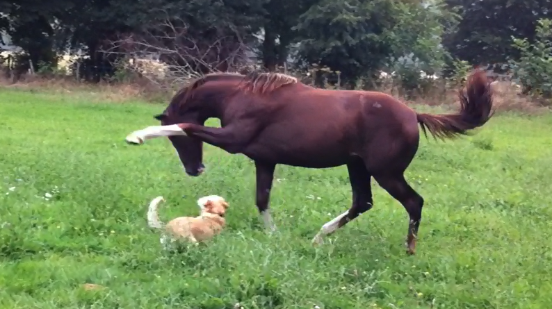 Ce matin, pendant que je faisais les clotures, j'ai surpris ma chienne et brindille en plein jeu!!