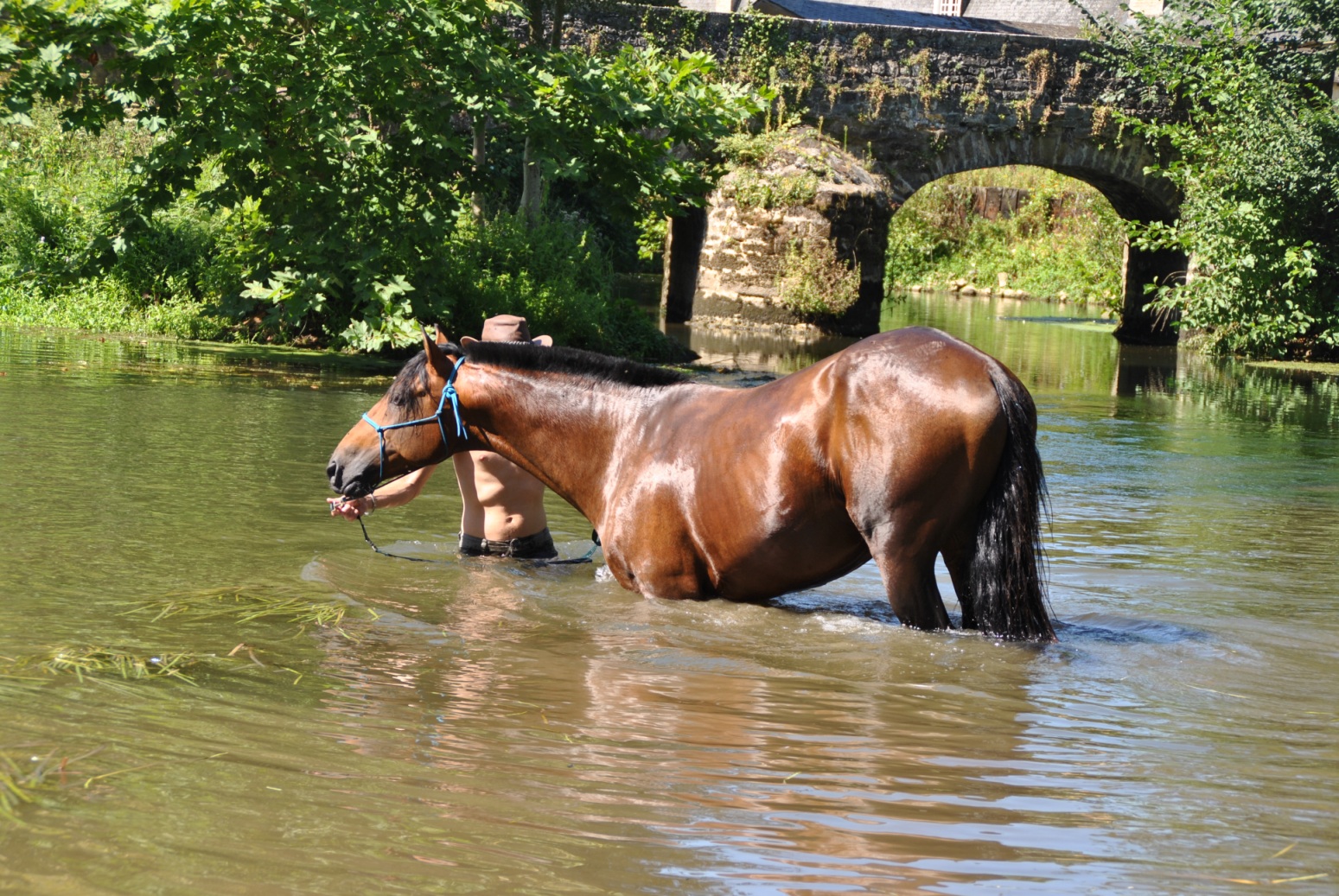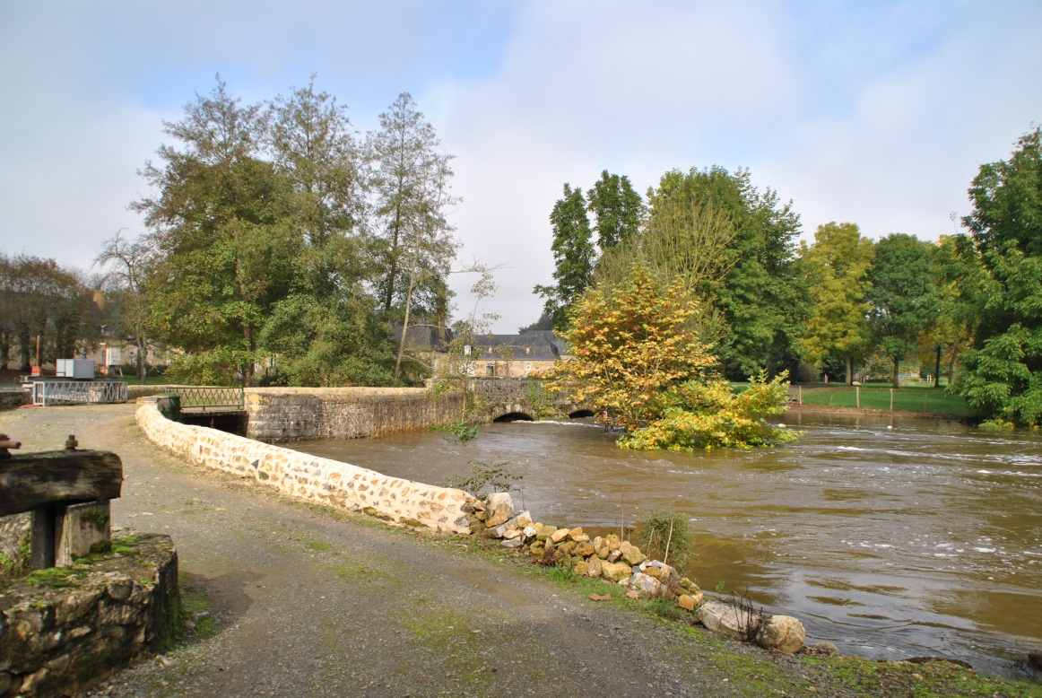 On voit entre les 2 photos la différence du niveau d'eau par rapport au haut des arches du pont. Là où je me trouve avec mon cheval sur la photo du bas, correspond sur le photo du haut à la droite de l'arbre où il doit y avoir au moins 3m d'eau actuellement.