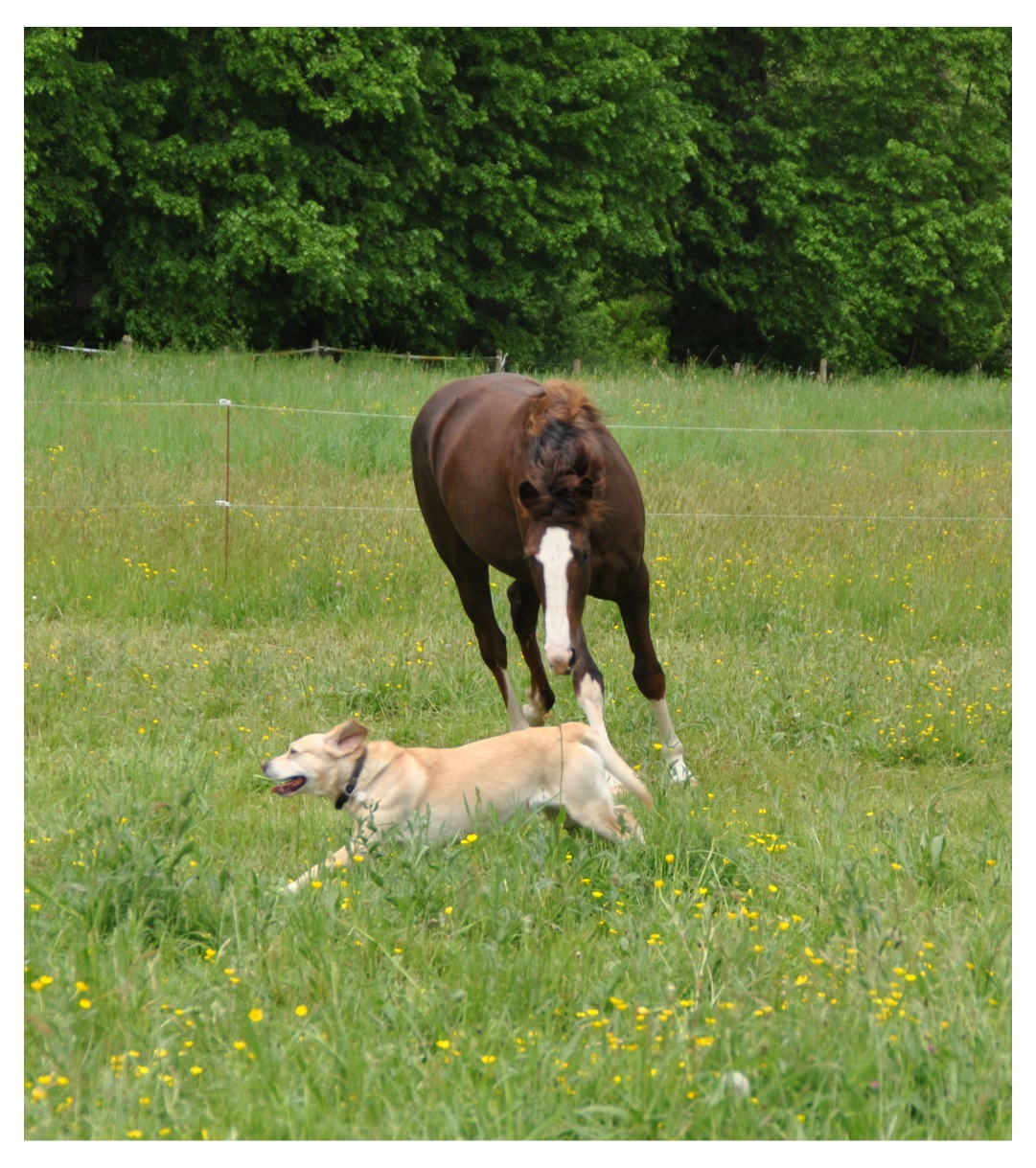 Alors elle a peur de pas mal de chose ( ya plein de trucs qui mangent les poneys chez nous ) mais les chiens par contre c'est son grand kiff elle adore jouer avec! 2 ou 3 pages avant j'ai mis le lien d'une vidéo ou elle est en plein jeux avec l'un d'entre eux justement!