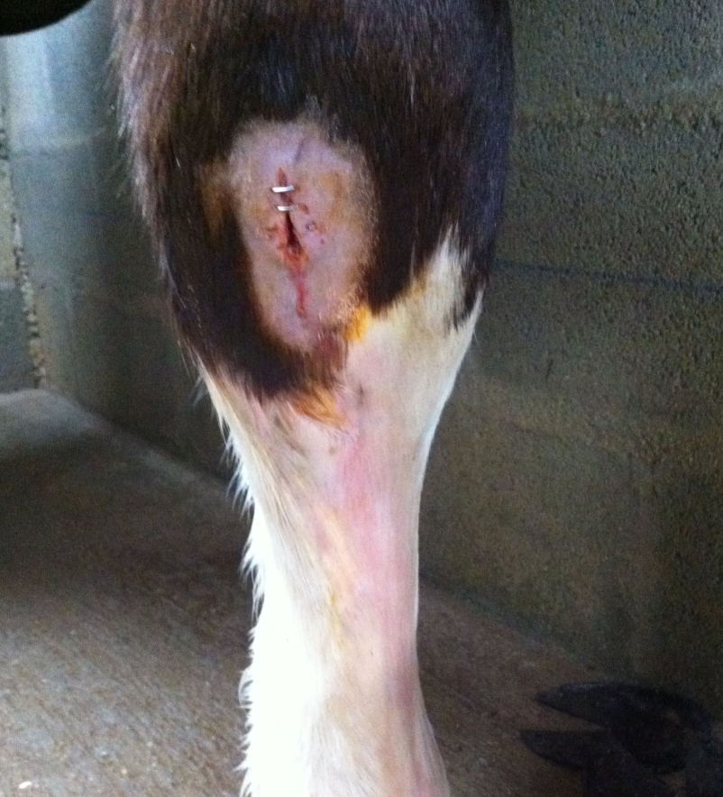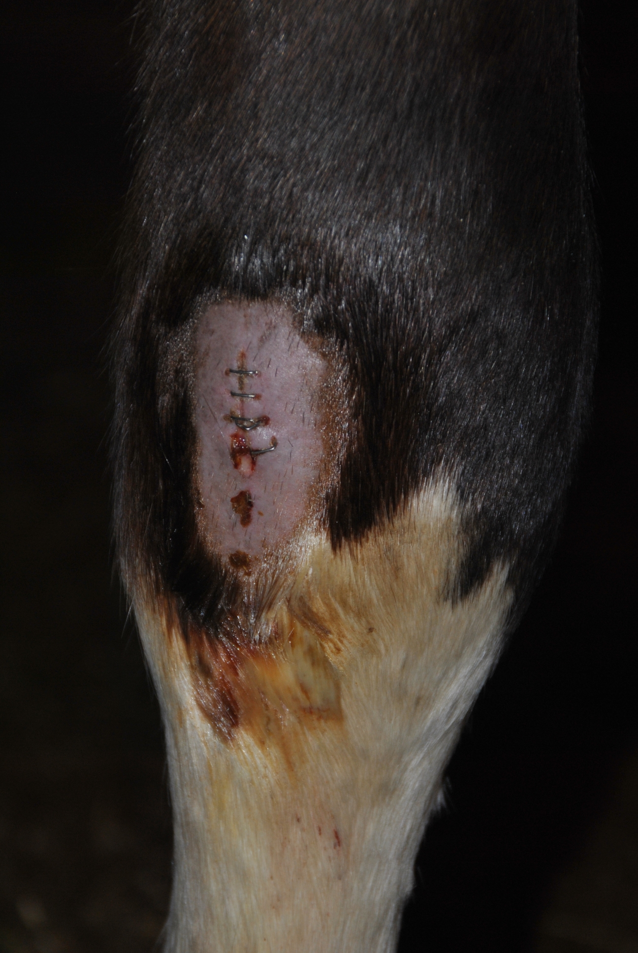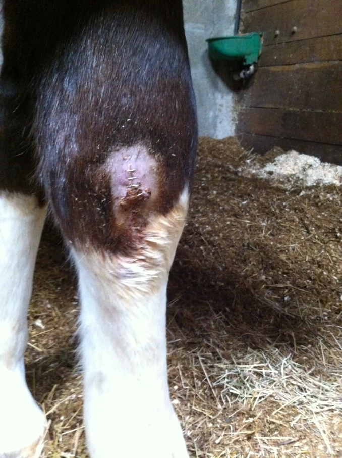 Mon bonheur de le voir guéri était destiné à être de courte durée manifestement, puisque grâce au grand professionnalisme de certaines personnes, Zach a été à nouveau grièvement blessé, et DANS MON DOS, pendant mon absence en vacances !!! (Il a été sorti avec plusieurs chevaux dont un que je ne connaissais pas, SANS MON AUTORISATION et il a été tapé par l'un d'eux ; résultat décollement du muscle et plaie profonde).