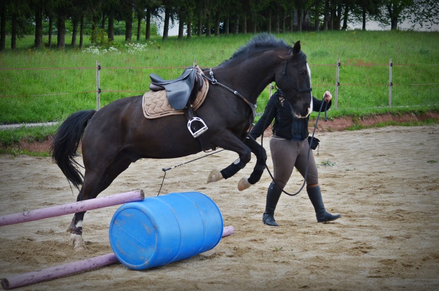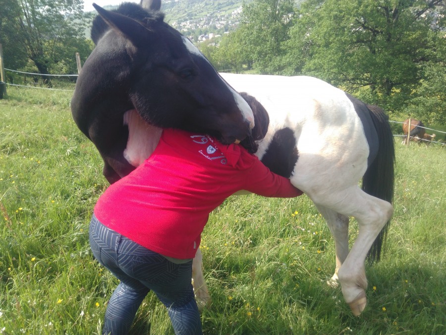 Après plusieurs minutes de "lutte", l'autre jument, Orphée, y va, Brume suit, pas trop rassurée, mais ça va quand même.