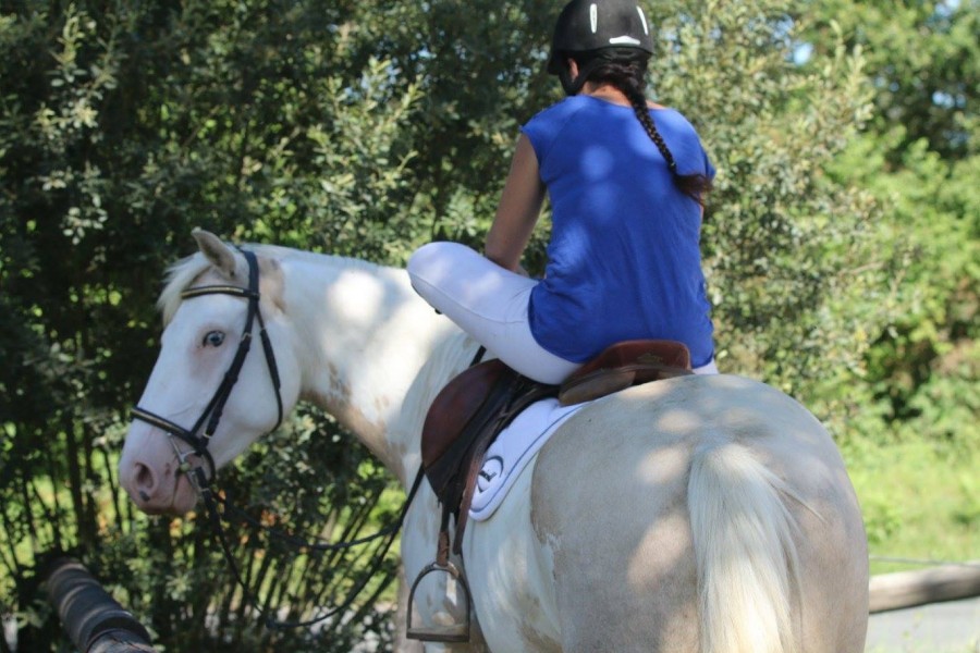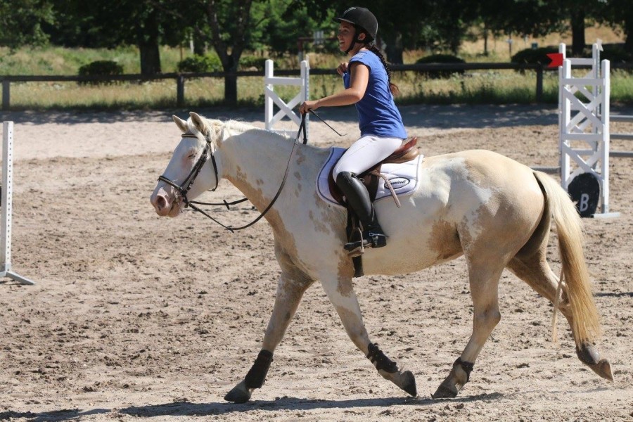 A cheval l'après-midi, on a refait rapidement les exos du matin, puis on est allés dans le terrain varié : passage entre des frites, pneus de tracteur, bâche en l'air, trainer un bidon. C'était sympa, mais encore une fois, trop facile pour émouvoir Bahama. Du coup, on a profité du terrain et on est allées jouer sur le cross avec le petit piano, les contre hauts/bas, les pneus. C'était une première pour elle. Elle a juste été impressionnée par le trou. Enfin moi aussi je le regardais de travers