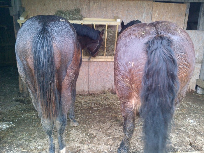 sinon ce matin, une bonne séance de longe pour boleane! un bonheur!! d'abord le tapis, la selle comme si elle avait fait ça toute sa vie, ensuite le side pull, bon elle a les oreilles abimées par les mouches alors faut les toucher doucement... après longe, étriers descendus (1ere fois) à peine de petits écarts lors du 1er tour! pas, trot, galop nickel, elle a pas rechigné comme la dernière fois! yes! enfin...sac a patate et 3 pas ensuite je suis descendue, j'étais seule je ne voulais pas pousser trop mais elle en avait rien a faire!