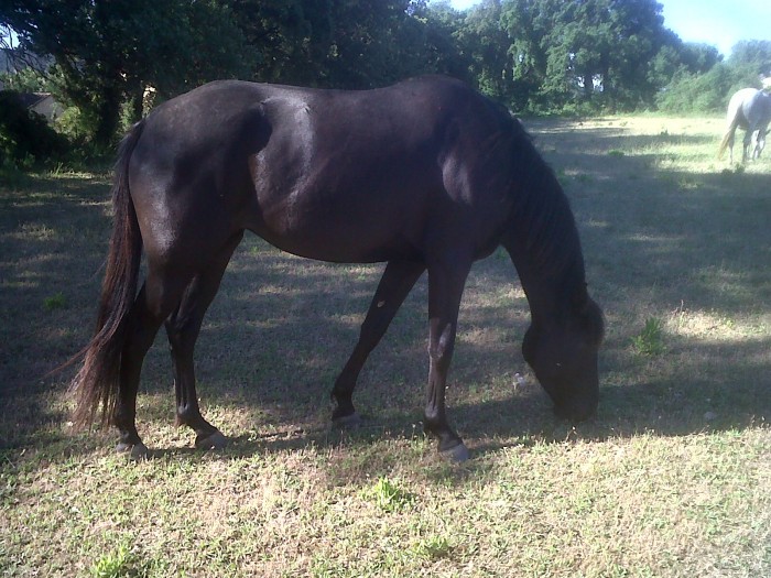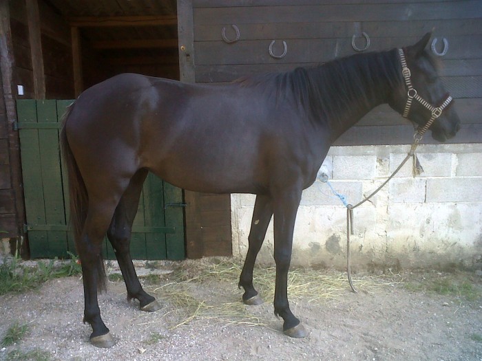 Je suis montée dessus le 27 mai........ Et elle n'a rien dit! Julia la tenait et lui donnait un peu d'herbe en même temps, et ben à part deux ou trois pas, pas très stables, elle n'a pas bougé!