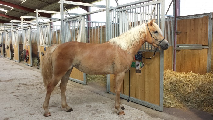 Aujourd'hui elle a été ferrée aux antérieurs + parage postérieurs, car elle est sensible (sol caillouteux) + aplombs bofs bofs.