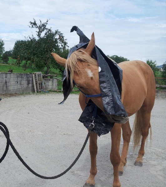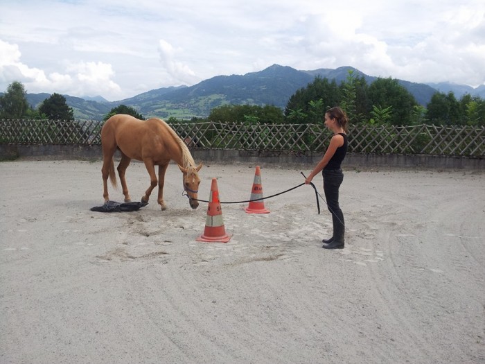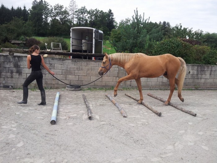 Mlle se rebelle dès la moindre contrainte, donc la longe qui frôle les fesses, la tension sur le caveçon (qu'elle connait pour la longe pourtant).
