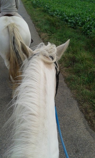 et hop retour au pas tranquille, rênes longues. Elle en avait un peu marre, je le sentais, elle fouillait de la queue, mais peut etre aussi parce que ma selle actuelle est trop longue, et du coup ça la gène. J'ai hate d'avoir la selle adapté!