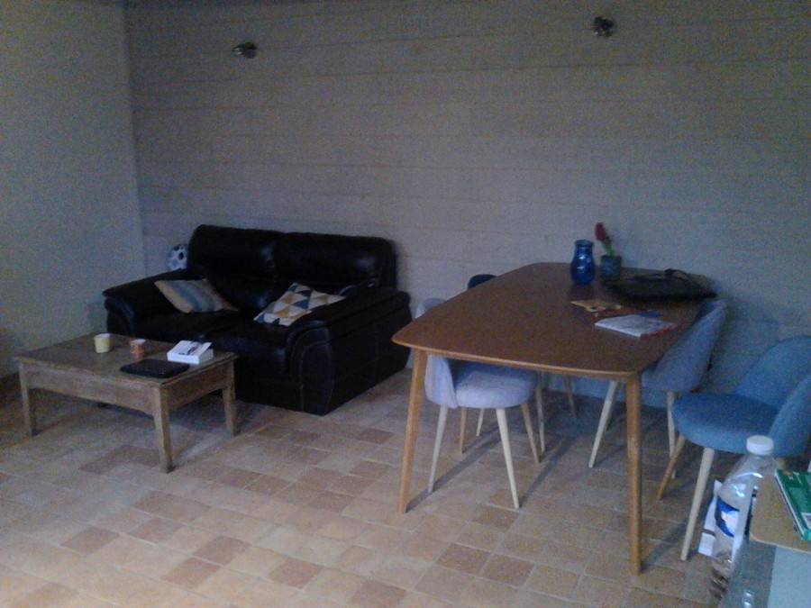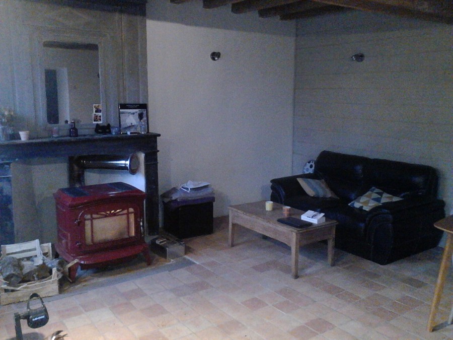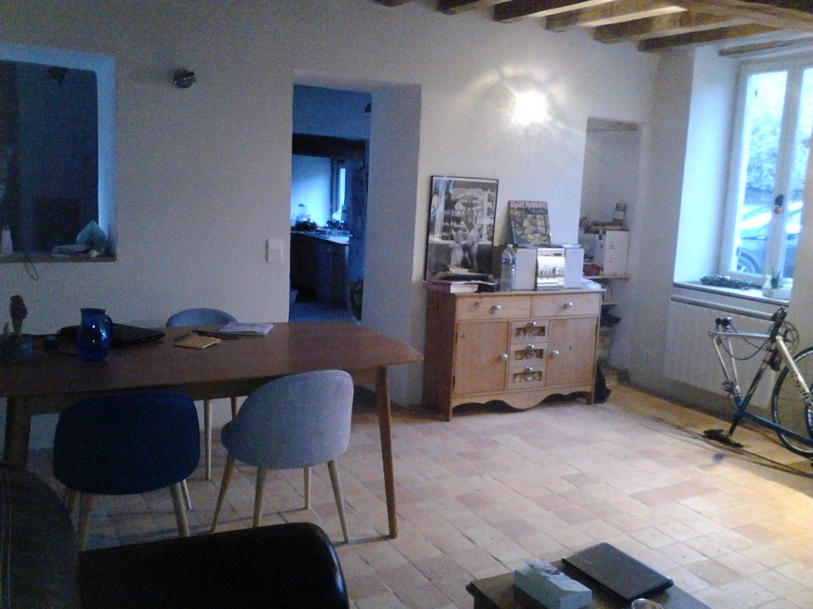 Le salon: avec la nouvelle table, les nouvelles chaises. Il nous manque un tapis et un fauteuil. On doit mettre aussi un autre rideau à la place de celui à côté du poele, la couleur nous plait pas.