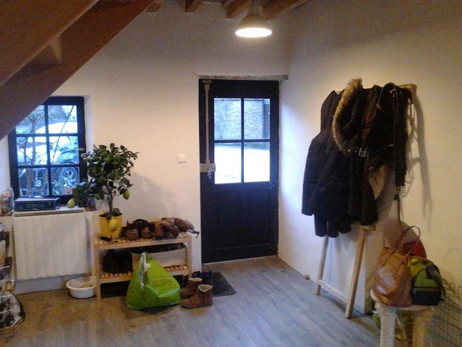 La porte d'entrée/entrée: on a ajouté la patère et on cherche un système de caisse assez grande pour mettre les chaussures et remettre le banc dans la salle de bain (son emplacement initial) + un tabouret/chaise et une table d'appoint pour le citronnier.