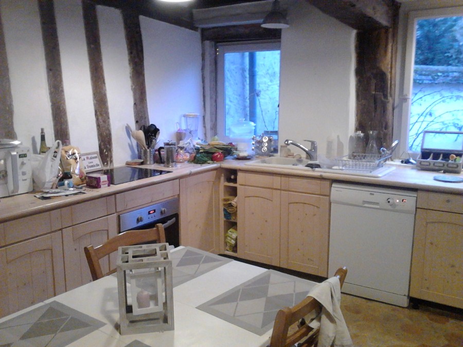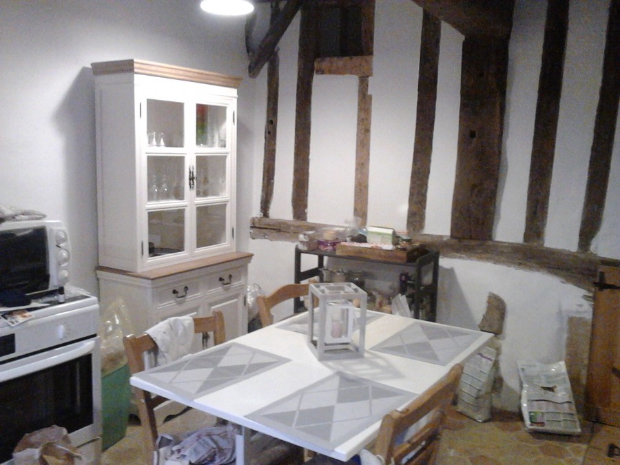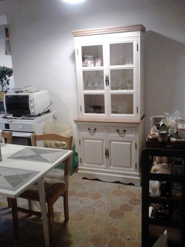 Et la cuisine: avec notre nouveau vaisselier + plus aucun cartons ^^, on a prévu de peindre les portes et les tiroirs en blanc + mettre des poignets qu'on n'a pas encore trouvé:
