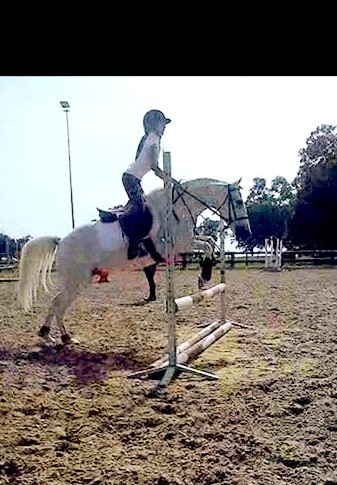 Et ici c'est une vieille photo, poney d'1m35 comme le tien, gabarit arabe, mais avec moi en plus petite et légère, un poney d'1m35 pas porteur, ça passe tout de suite mieux avec 30 kg sur le dos, comme ton petit cousin, non?