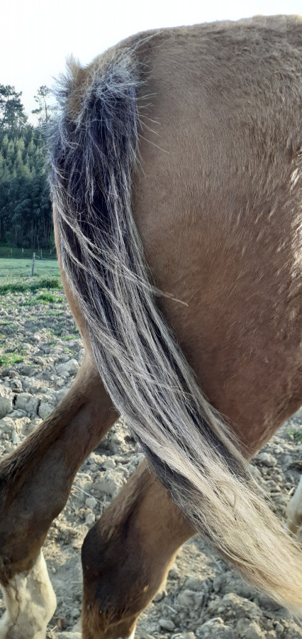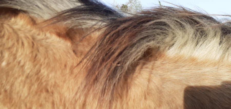 Voilà que Krystal me fait du crin tricolore ! Les poils sous sa mue sont quasi alezans sur le dos, ça brille au soleil... décidément elle m'en fera voir de toutes les couleurs cette petite !