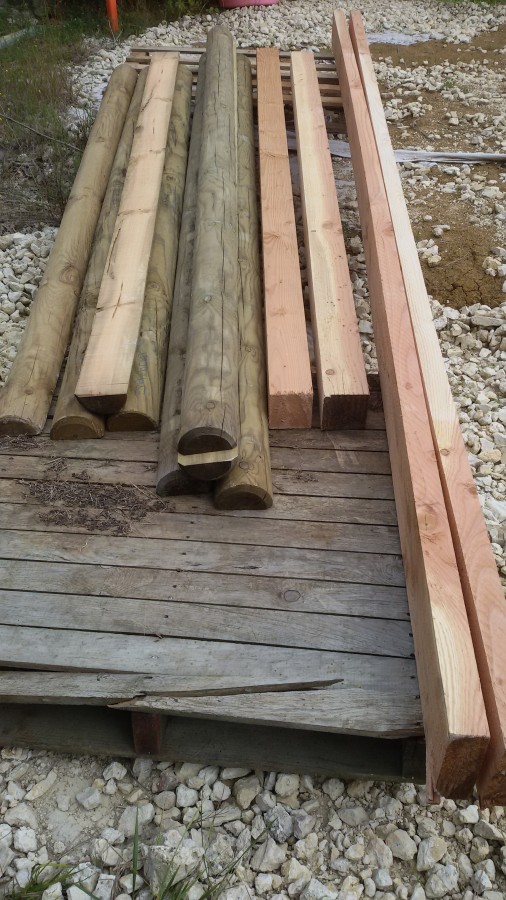 - je suis allée chercher la commande de bois pour remonter l'abri qui était tombé avec la tempête... c'est pas encore gagné, il faut tout couper à la bonne mesure et refaire les trous à l'identique... avant tout ça, je dois rammener tous les morceaux cassés pour prendre les cotes...