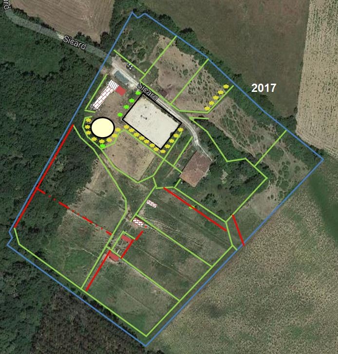 Conserver un abri comme 'local technique' pour le stockage de l'aliment, des couvertures, licols et seaux de brosses, et servira potentiellement d'abri 'infirmerie' en attendant que le bâtiment 'écurie' soit terminé.