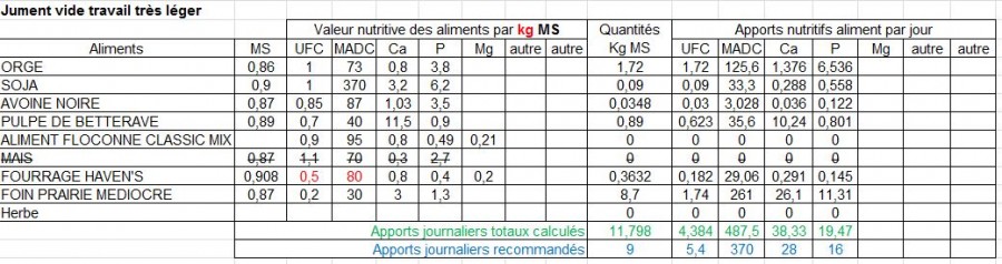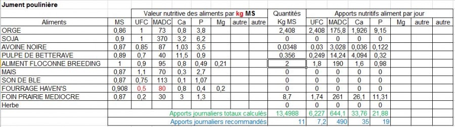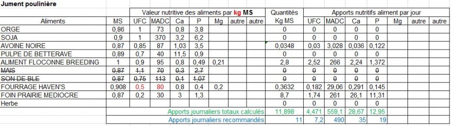 Les 2 poulinières sont en aliment complet, il y a également un fort déséquilibre MADC/UFC, et si j'ajoute de l'aliment complet, le ratio est encore plus déséquilibré...