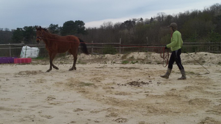 J'ai pris du retard sur.la.manipulation des pieds postérieurs, alors j'ai profité que nous soyons 2 pour faire avec une longe : surprise et réactions, mais rien d'ingérable. Les 2 postérieurs étaient OK à la longe à la fin de la séance... à peaufiner donc samedi prochain...