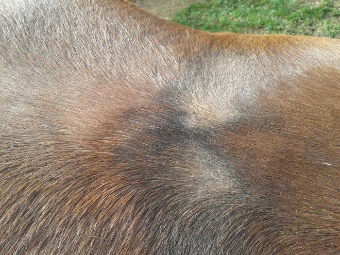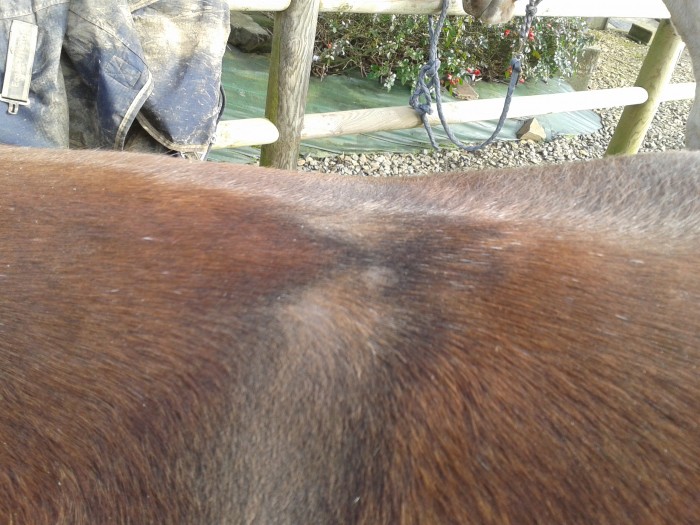 Mon ancienne selle l'avait blessé à l'arrière, sous la couture du tapis, je pense qu'elle devait trop appuyer derrière mettant une pression assez importante sur la couture, mon cheval n'avais alors presque plus de poil à cette endroit à cause des frottements..
