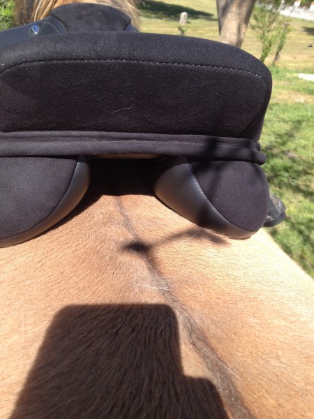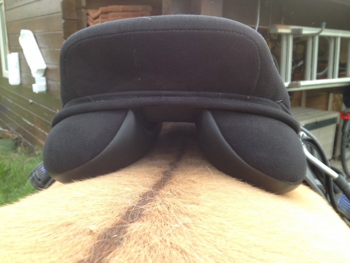 Bon voilà, aujourd'hui visite de contrôle +/- un an après l'achat de ma Thorowgood Endurance. Elle avait besoin d'un petit reflockage, elle s'était plus tassée devant que derrière, donc elle appuyait plus devant... D'où les traces de transpiration anormales alors que l'arcade n'était pas trop étroite.