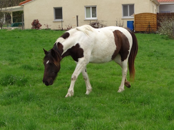 Elle est pour le moment au pré avec sa mômam, peureuse mais très caline quand on lui laisse, le temps, et surtout très chipie