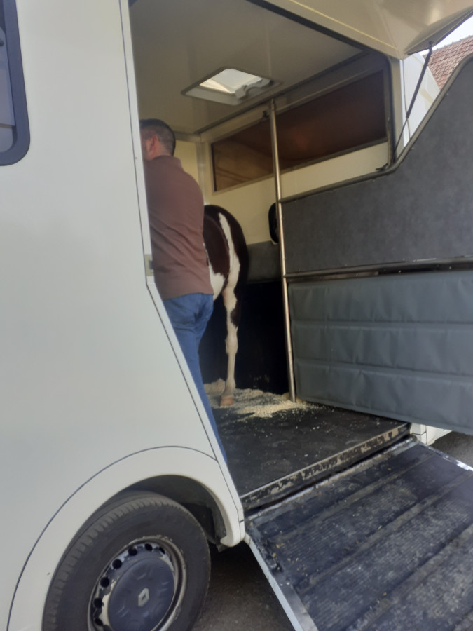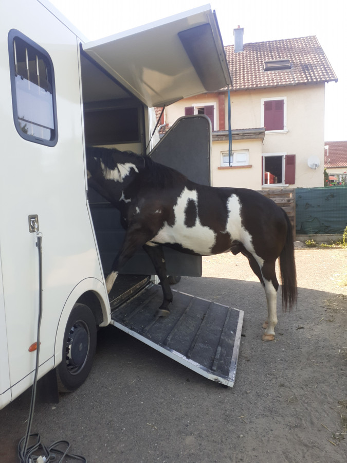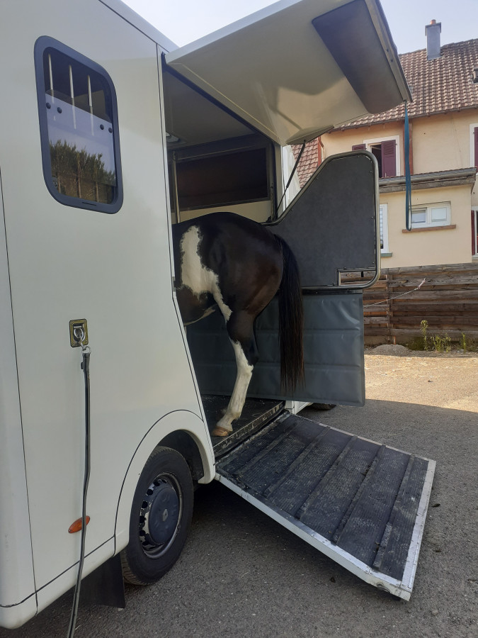 Bon 2ème séance hier pour Flash avec le camion!! Au bout de 30min il est monté sans problème... 30min encore pour qu'il se place correctement... et 30min encore après pour qu'il se place et reste tranquille.. il prenait peur dès qu'il sentait les parois derrière ses fesses en fait...