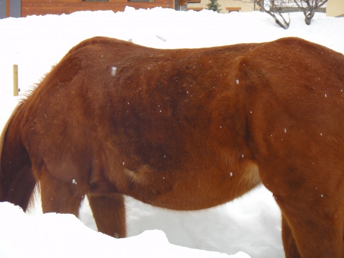 J'ai l'impression que cette pauvre jument n'a jamais été complémentée de sa vie, et que la propriétaire elle-même n'avait pas connaissance de l'existence des compléments alimentaires, sans s'alarmer de l'état de la bête qui se dégradait de jour en jour...