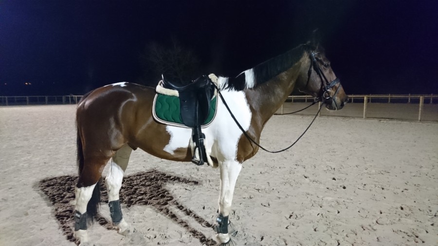Et du galop, allonger reprendre... bah j'ai complètement galérer... je sais pas si c'est l'effet bride... mais alors ça n'allait pas, il s'appuyait ou fuyait le contact en secouant la tête en faisant des trucs bizarre.... il a corné vite fort... galop/trot/galop ça allait , même si la descendante aurait pu être plus jolie, un peu de contre galop large, bof les petits cercles au galop, puis retour au trot où j'essayais d'avoir la sensation de la veille, assise, et lui qui me porte, sauf que là il jouait pas le jeu, du coup moi agitée dessus, impossible de tenir ... essayé de developper impossible aussi, il ne réagissait pas (puis sans stick, rien a fiche le poney)...
