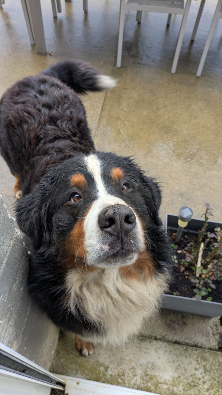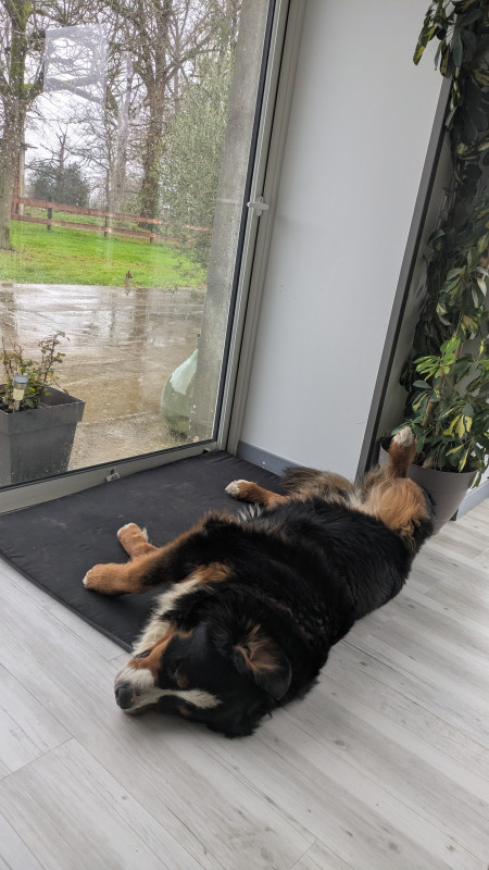 Bref, vu qu'il avait été chiant avec le bain, yavait de l'eau par terre, plus cette dalle méga glissante de base et hop, un tomi par terre (attaché bien sur...) qui s'est retrouvé sur les 2 boulets postérieurs... et les genoux encore...