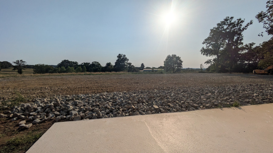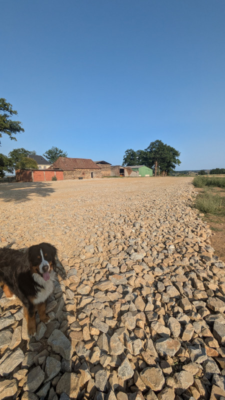 (ah si! La première couche de très gros cailloux est étalée, au final on a fait appel à un terrassier, je ne sais pas pourquoi ce revirement de situation, je ne pose plus de question... je ne sais pas quand arrive l'autre couche, l'entreprise était en vacances ...)