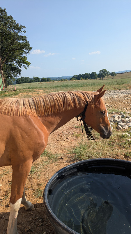 Vendredi : pas levée assez tôt, il faisait déjà 2000 degrés à 10h, j'ai donc fait mi TAP mi longe dans un coin à l'ombre pour tomi. Le terrain est dur, j'ai pas trop insisté, mais il était relâché au trot, nickel. le galop vraiment 2 cercles et terminus.