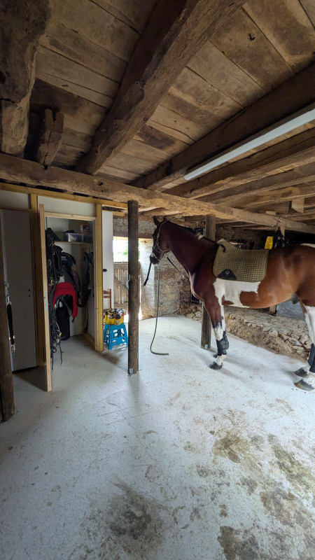 Voila, je n'ai toujours pas THE carrière, ni mes boxes, qui vont commencer à me faire besoin (enfin l'abris dans le 2ème pré), mais cela avance tout petit à petit (faut que je clôture mon dernier bout de pré : idem, faut que je mobilise mes hommes), et cette sellerie, salle de pansage, douche, c'est le FEU!