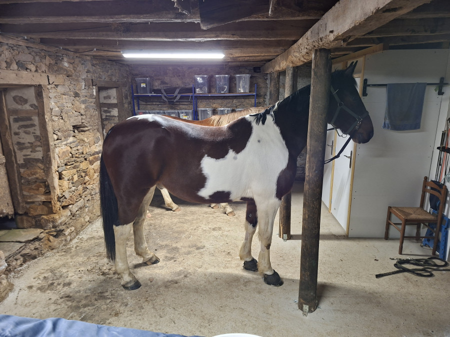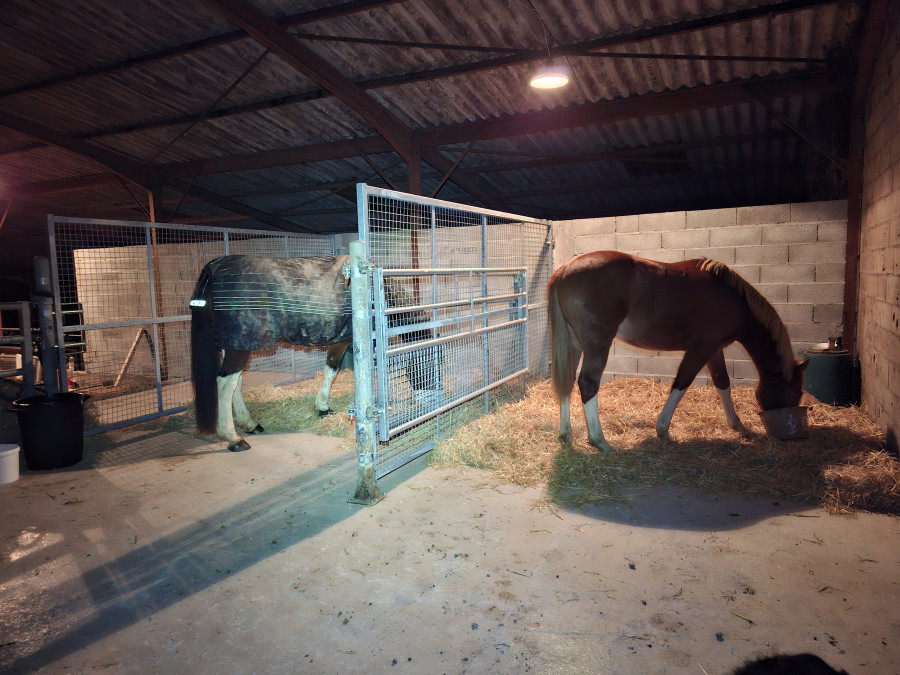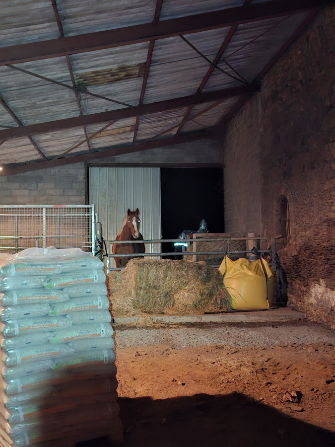 Le hangar non fermé, tu veux dire la porte ouverte à moitié? Alors en fait, ce sont des boxes libres service (que je fermerais en cas de besoin : maladie, tempête...). Il donne sur leur pré, donc je laisse ouvert pour qu'ils y rentrent et sortent à leur guise. J'ai eu des chevaux aux boxes, cela demande quand même bcp d'intendance. Là ce sont eux qui se gèrent, et qui font ce qu'ils veulent.