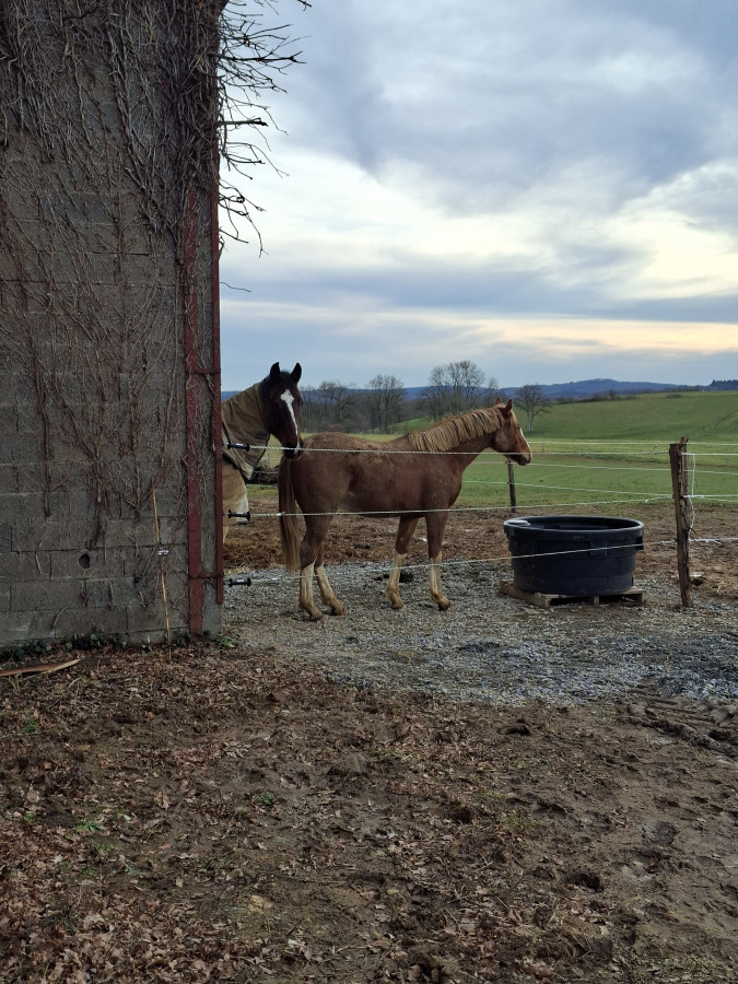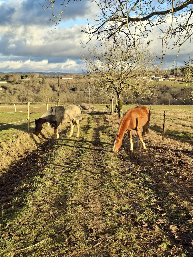 ), je les mets ailleurs, le temps de nettoyer la stabu (plus pleine de boue que de crotte d'ailleurs, tom était soulé de l'enfermement, orly vu la quantité de paille et foin dans ses cheveux, a du faire de belles siestes...). Je tente de mettre des piquets en fibre de verre, bien plus grand le long de mon chemin (mais quelle galère ces trucs, c'est souple dc dur de planter ça droit, et alors cimer les micros coupures), bref, j'arrête en me disant que je verrais ça le lendemain. Je remet les chevaux dans le 1er abris, là au moins les clôtures piquent et son ok.