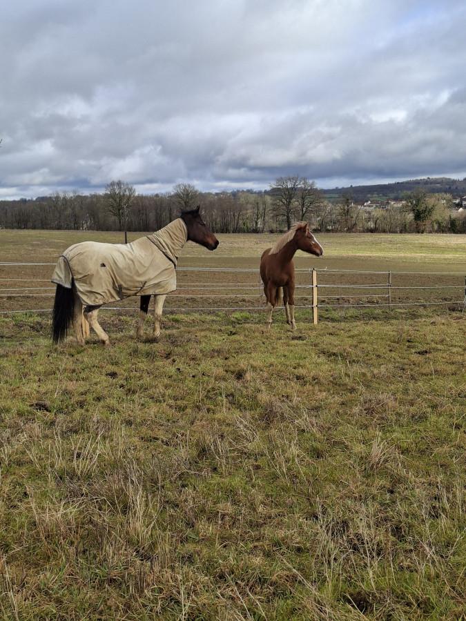 Ce matin j'avais peur pour la bride (carpienne) de tom, mais ouf, tout était ok. J'avais perdu orlando, qui était couché un peu plus loin.. mais qui s'est levé pour réclamer sa friandise avant que j'ai eu le temps de le caliner. Tom aussi a du se couche, vu la trace mouillé sur un flanc, que d'un coté! ah!