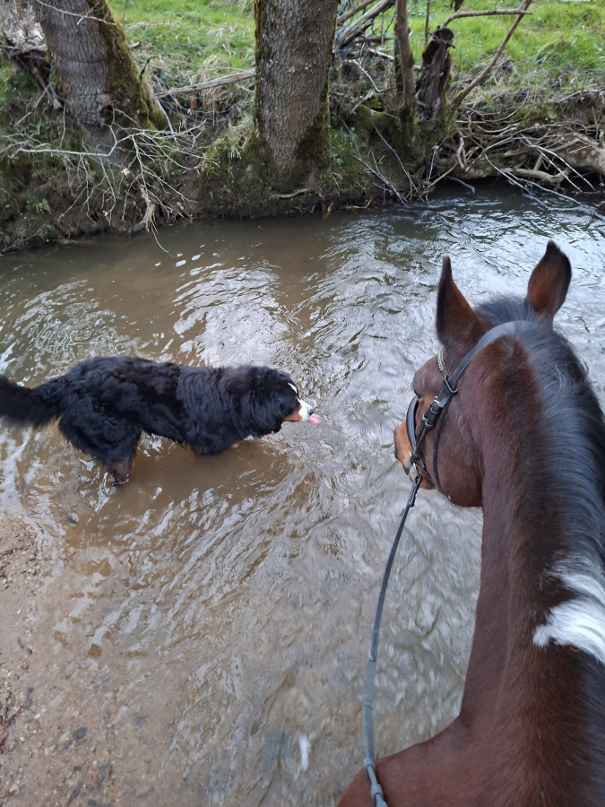 Dimanche, une autre balade avec mon tom, j'ai tenté un autre endroit de la rivière (déter la meuf), bon beaucoup de branches basses un peu relou. J'avais pas encore repris ce chemin, car très pentu, il fallait que j'évite de solliciter trop fort les antérieurs, mais bon faut bien remettre aussi un peu de contrainte petit à petit.. Bref, je prend la maxi descente, et arrive à la rivière, où j'ai laissé tom 10min, au début ça le soulait puis il s'est détendu, et a profité de la balnéo.