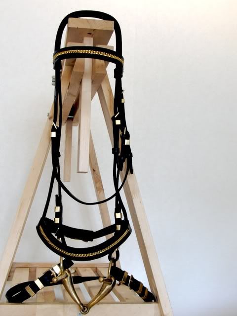 Je vais bientôt me faire un bridon en cuir noir et bouclerie dorée (avec passants en métal doré et chaînette dorée sur frontal et muserolle), idem pour les rênes.