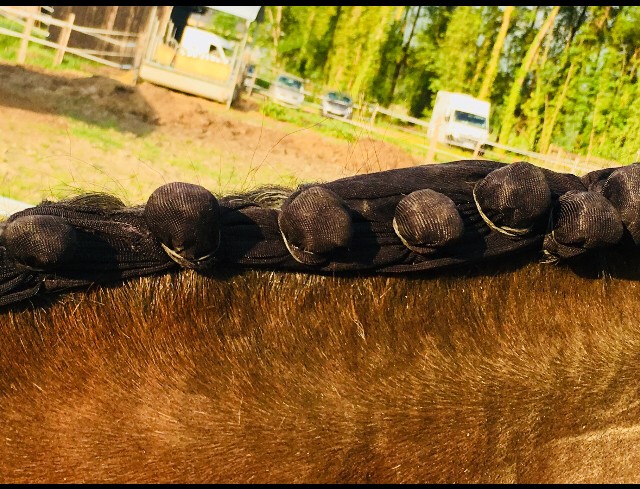 7h50: on commence a finir de préparer les loulous; tresses de queue, toupet et puis on selle.