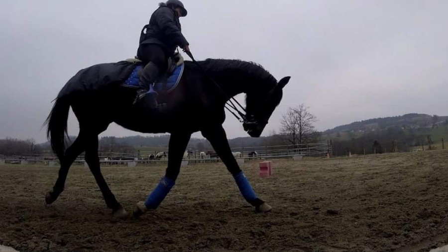 Au trot : pas stable de l'avant mais je pense il faut continuer dans ce sens ! Par contre les postérieurs ne suivent pas les anterieurs sur le cercle : donc pas de rectitude , pas de bonne position , peut être essayer de tenir les hanches avec ta jambe , ou essayer de rentrer les hanches à l'intérieur du cercle !