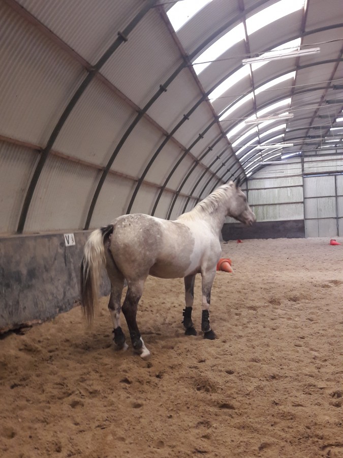 Aujourd'hui 50 minutes de stretching pour Amor. Ne sachant pas avant de monter si le tapis pouvait être en cause, j'ai opté pour l'option radicale en sellant sans tapis ! Je conseille pas pour la selle, il m'a fallu 1/4 d'heure pour décrasser la pauvre après.