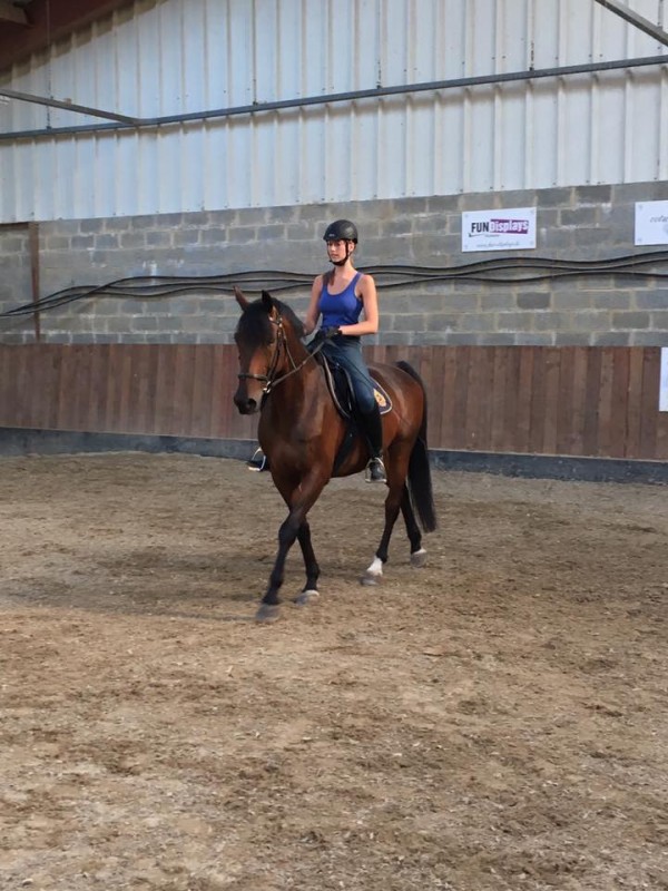C'est une jument qui appartenait a un cavalier pro de CSO avec qui il a passer son BPJEPS, il l'a toujours monté très enfermé (rênes allemande en permanence) et moi je travaille depuis que je l'ai a l'avoir étendue et vers le bas.