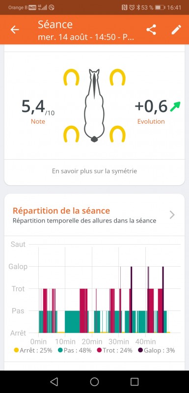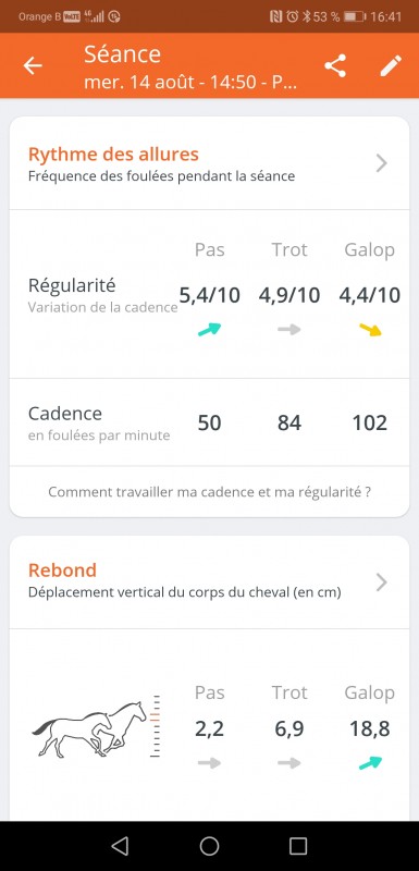 Le gros chantier c'est sûr moi : me redresser, droite, ne pas tirer à gauche (mains plus forte, j'ai tendance à l'encapuchonner du coup, j'ai du mal à ne pas tirer dans la flexion à gauche, alors qu'à droite c'est pas mal). Freiner avec mon dos, contrôler le rythme avec ma ceinture abdominale. En faisant ça, je dois pas ralentir dans les mains, la jument suit le rythme de mon corps (et si elle veut accélérer, elle agrandit ses foulées, on la laisse pas faire mais les sensations sont ouf, elle prend de la force et de l'équilibre !). Donc si je monte bien, c'est facile.