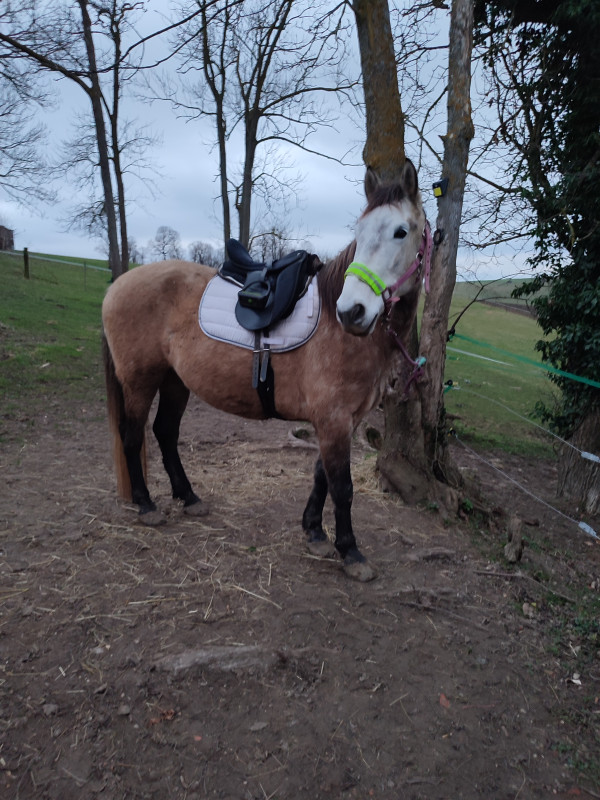 Bachir, p'tite séance montée au pas et au trot bien sympa ! Bon au début au trot il trainait donc j'ai du l'activer avec le stick (enfin un manche de chambrière, prochaine fois je prend un vrai stick lol), ensuite ça a roulé ! Pas, trot, cercles, diagonales, transitions montantes dans la montée mouahaha (le pré est légère pente mais assez pour qu'on la sente bien), et descendantes dans les descentes, double mouahaha.