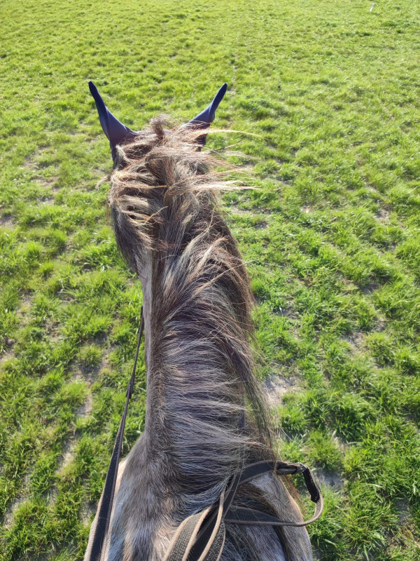 Du coup avec elle mission moins d'amplitude mais rebond++ donc flexion des jarrets (j'ai pu l'observer un peu dans certains cours et elle les fléchi peu), montée du garrot, va falloir lui apprendre à aller vers le haut et l'avant, plutôt que vers l'avant et le bas. Barres au sol mais genre pas 4, mais une bonne ligne de 8 barres alignées un poil plus serrées que son amplitude naturelle, peut-être jouer un peu avec l'amplitude du pas et du trot, qu'elle garde cette envie d'aller en avant mais la convertisse en mouvement un peu vertical, voir si elle est d'accord pour que je lui relève un peu l'encolure en la gardant devant moi (si elle se met direct au pas d'école je vais fondre lol), au galop je ne la connais pas encore mais peut-être juste travailler les départs. Genre départ au galop en équilibre depuis le pas, quelques foulées en équilibre et au trot, puis au pas, avant qu'elle ne commence à descendre et à s'écraser, et recommencer, qu'elle se soutienne vraiment devant ? Mais y'a moyen de faire des chouettes trucs je pense ! Quand on aura résolu ce p'tit souci de nuque et de posterieurs.