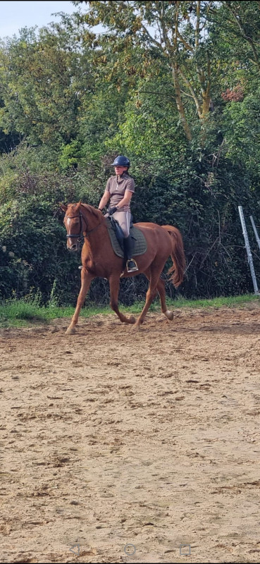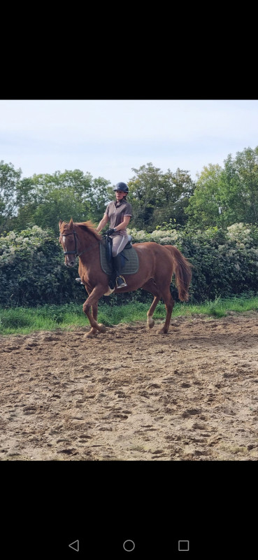 J’ai refait mes petits exercices de la dernière fois, un demi cercle avant de partir en pas de côté, au pas puis au trot, et « prends tes rênes en pont pour arrêter de bidouiller » ! Après ça a été mieux.