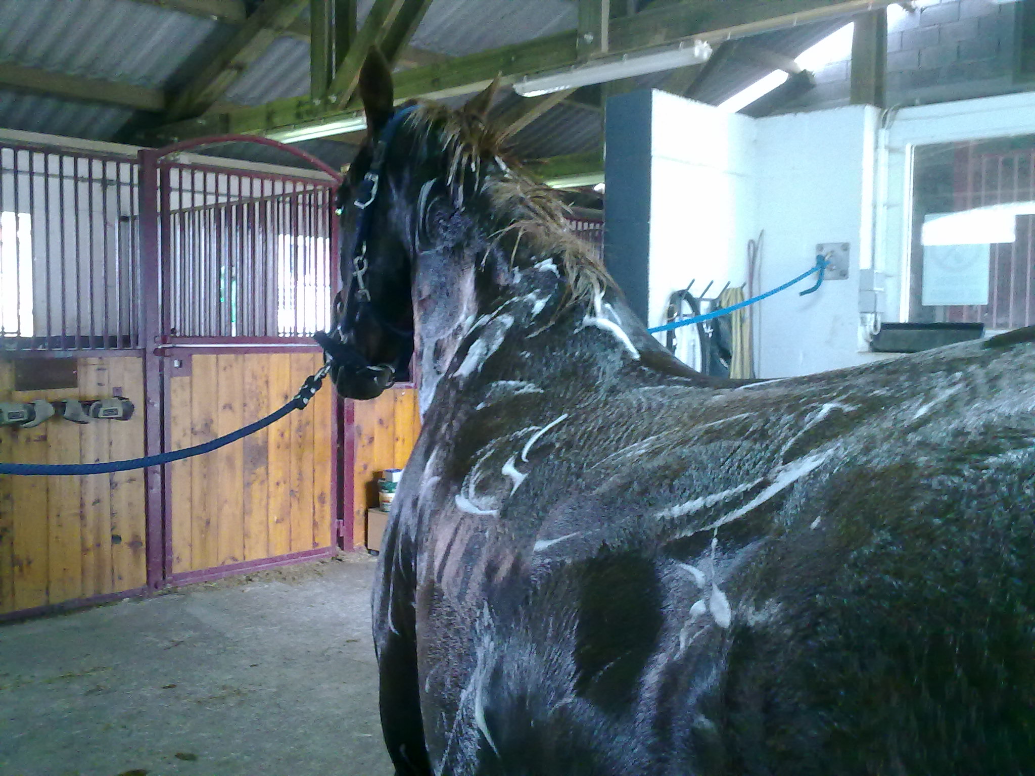 Coucou à toutes!!!!!! Je suis de retour de mes vacances!!!!! je suis vous ai suivi un peu pendant mes vacances, pas pu poster (du tel c'est pas très pratique). Je reviens de l'écurie là, trop contente d'avoir pu voire le Monstre après 10 jours loin de lui, la pluie n'aura pas eu raison de ma motivation je suis rentré trempée!!!! Le Monstre pas très en forme, il a beaucoup de mal à supporter les changement de température trop brutale, je suis arrivée il était sous un arbre tout tremblant les fesses serrées... Je l'ai emmené au sec, bien séché avec une couverture, donné ses grains,fait plein de câlins, je l'ai emmené marché dans le manège où il s'est empressé de se roulé le résultat était .