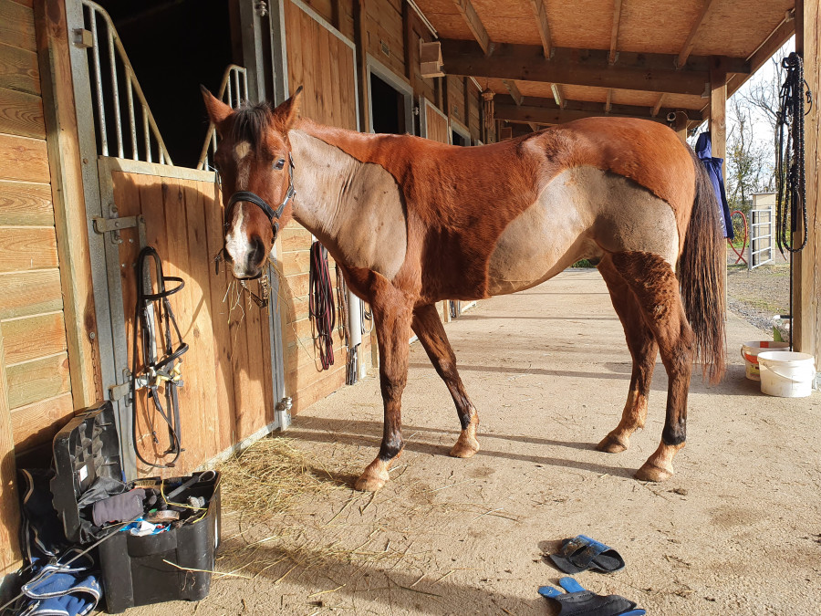 Mimi un peu électrique mais il n'y a pas photo, bosser sur du micro sable, ça aide par rapport à une carrière en herbe ! Il m'a épaté par ses progrès ! Top dans ses allures, attitudes, fonctionnement, contact. Il n'y a que sur les assouplissements en travail de deux pistes où il y a du travail. Il fait mais l'attitude est moins bonne, ça lui coûte un peu du coup on perd en aisance. On repart avec du travail à la maison et un cheval frais comme un gardon !