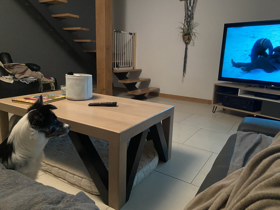 Punaise ce soir c'est la première fois qu'on allume la télé depuis qu'on a Tibou. Il est complètement absorbé par la télé et réagit a tous les bruits!