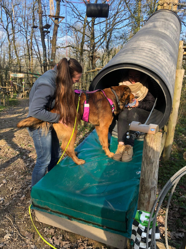 Super reprise. Vasco était méga-motivé, il nous fait 2 premières pistes superbes. J’étais bluffée par la première. En général, quand il y a un angle en tout début de piste, Vasco le loupe. Trop excité, il trace tout droit et réfléchit ensuite. Aujourd’hui il ne s’est pas fait avoir La victime était cachée en hauteur, dans une structure, mais ça ne l’a pas perturbé. Le toboggan pour descendre, c’était non par contre !