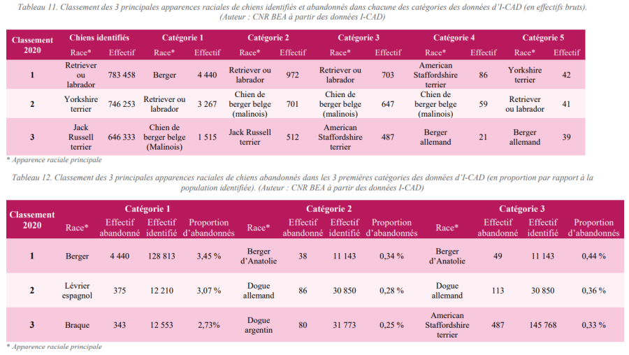 total de chien identifiés (Tableau 12). [...] Les résultats sont présentés pour l’année 2020 mais les top 3 des races de chiens les plus abandonnées pour chaque catégorie d’I-CAD sont sensiblement identiques d’une année à l’autre entre 2018 et 2020.